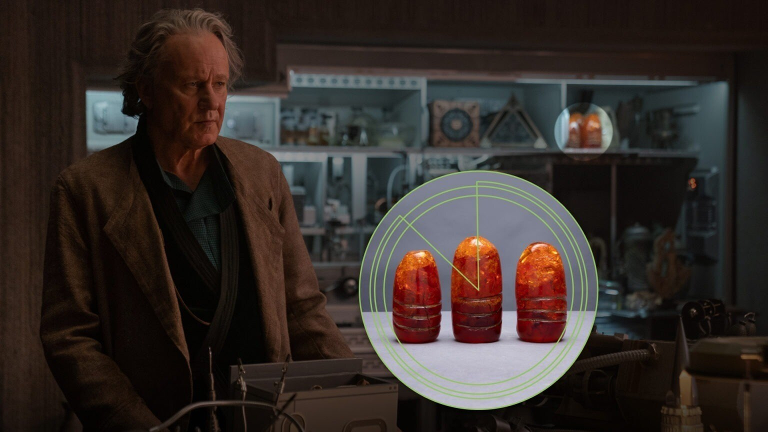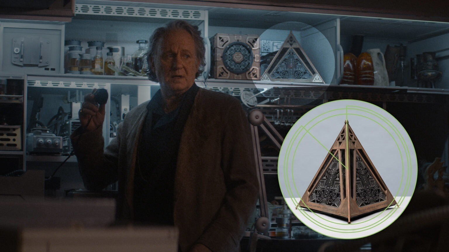 Entre os itens mais místicos, estão dois objetos que lembram holocrons — um com a estética Jedi e outro Sith. Guardar os dois no mesmo lugar? Perigoso, hein, Luthen…