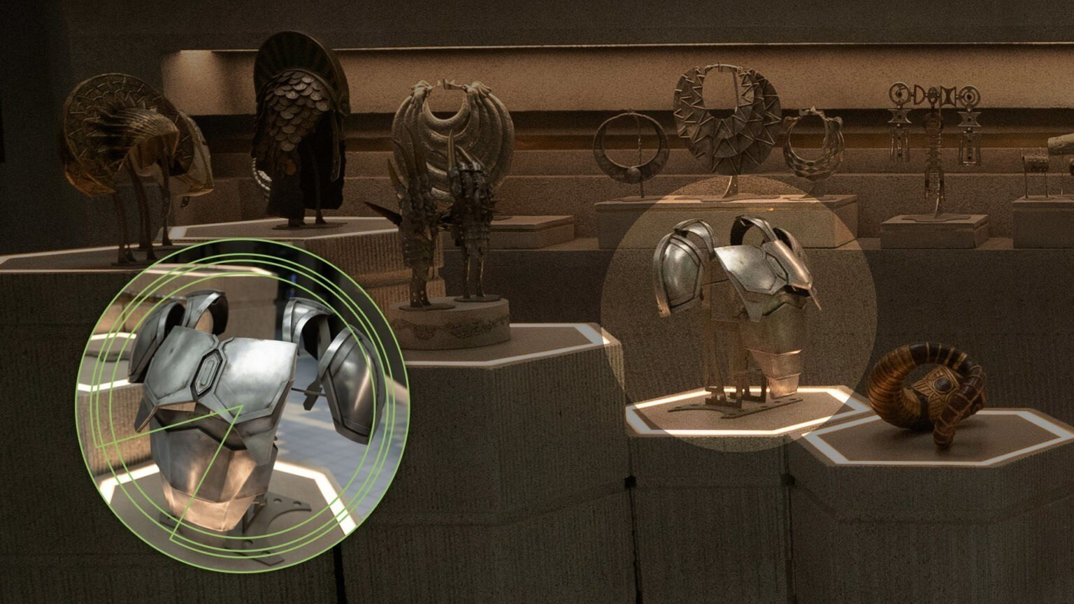 Várias vitrines da loja estão recheadas de peças que remetem a diferentes culturas e planetas do universo Star Wars, incluindo Mandalorianos e talvez até artefatos da Velha República. Um prato cheio pra teórico de lore!