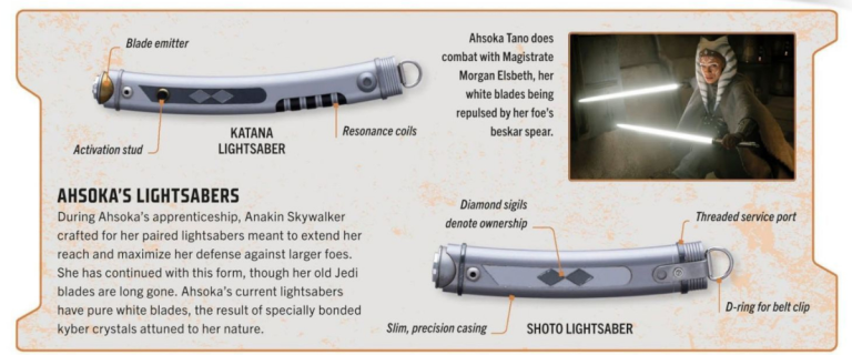 O guia visual confirmou os nomes oficiais e as inspirações por trás do par de sabres da nossa “Wayseeker” favorita. Tecnicamente, Ahsoka carrega uma “Katana Lightsaber” (a lâmina principal, mais longa) e um “Shoto Lightsaber” (a lâmina secundária, mais curta).